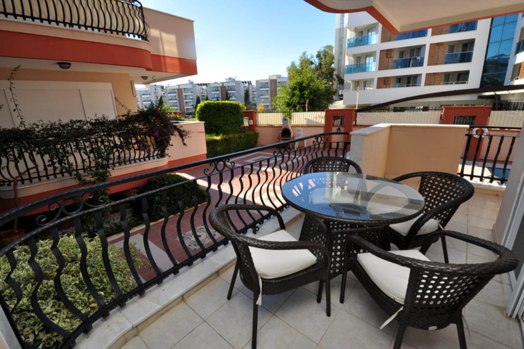 American kitchen with oven, hob, refrigerator and dishwasher. Furnished balcony with table and chairs. Holiday home with inviting balconies for the warm summer nights. A Peaceful holiday home furnished and ready for occupation.