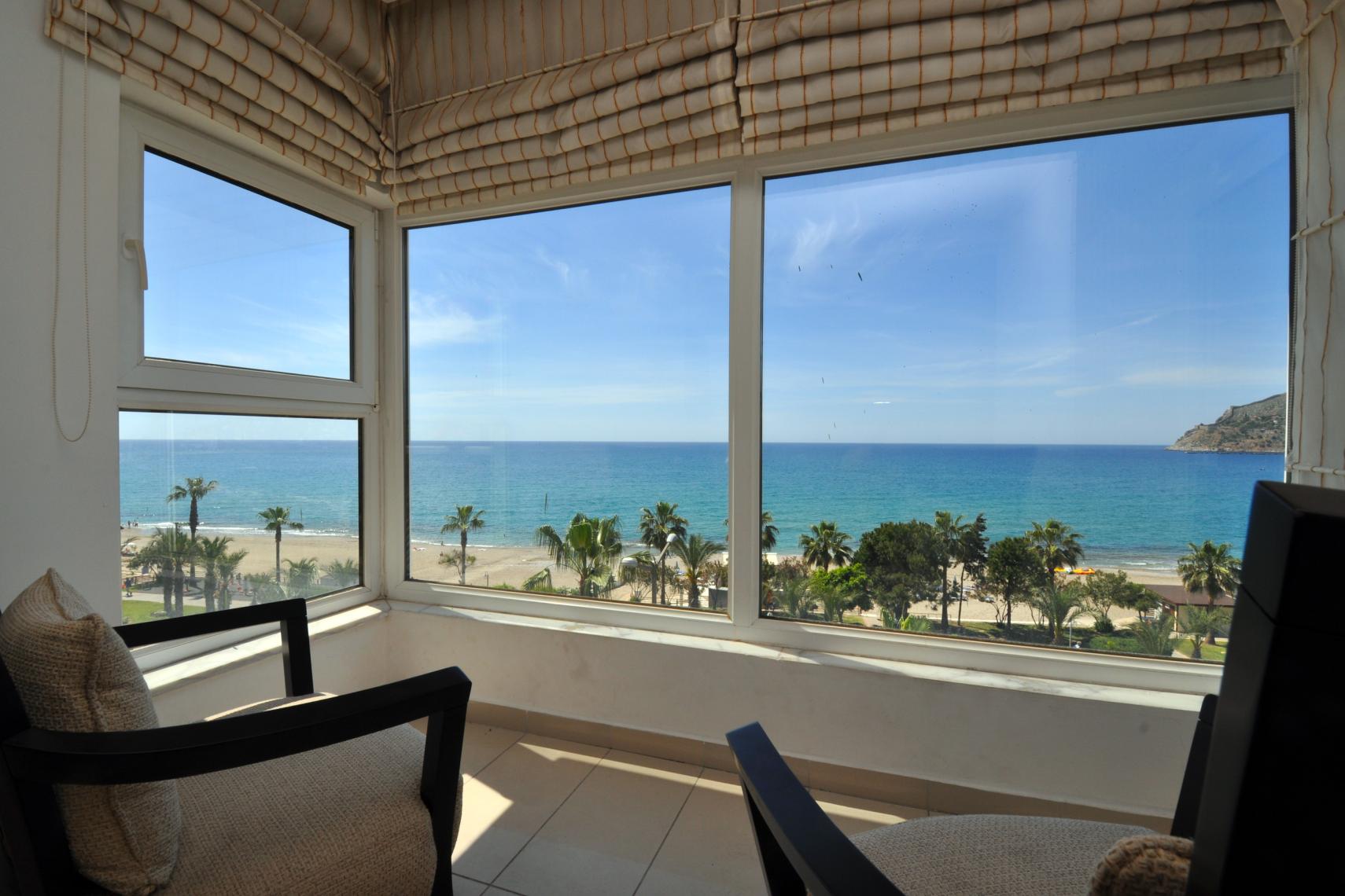 Niewiarygodny widok na morze i port w Alanyi.. Niezrównany widok na plażę i morze..