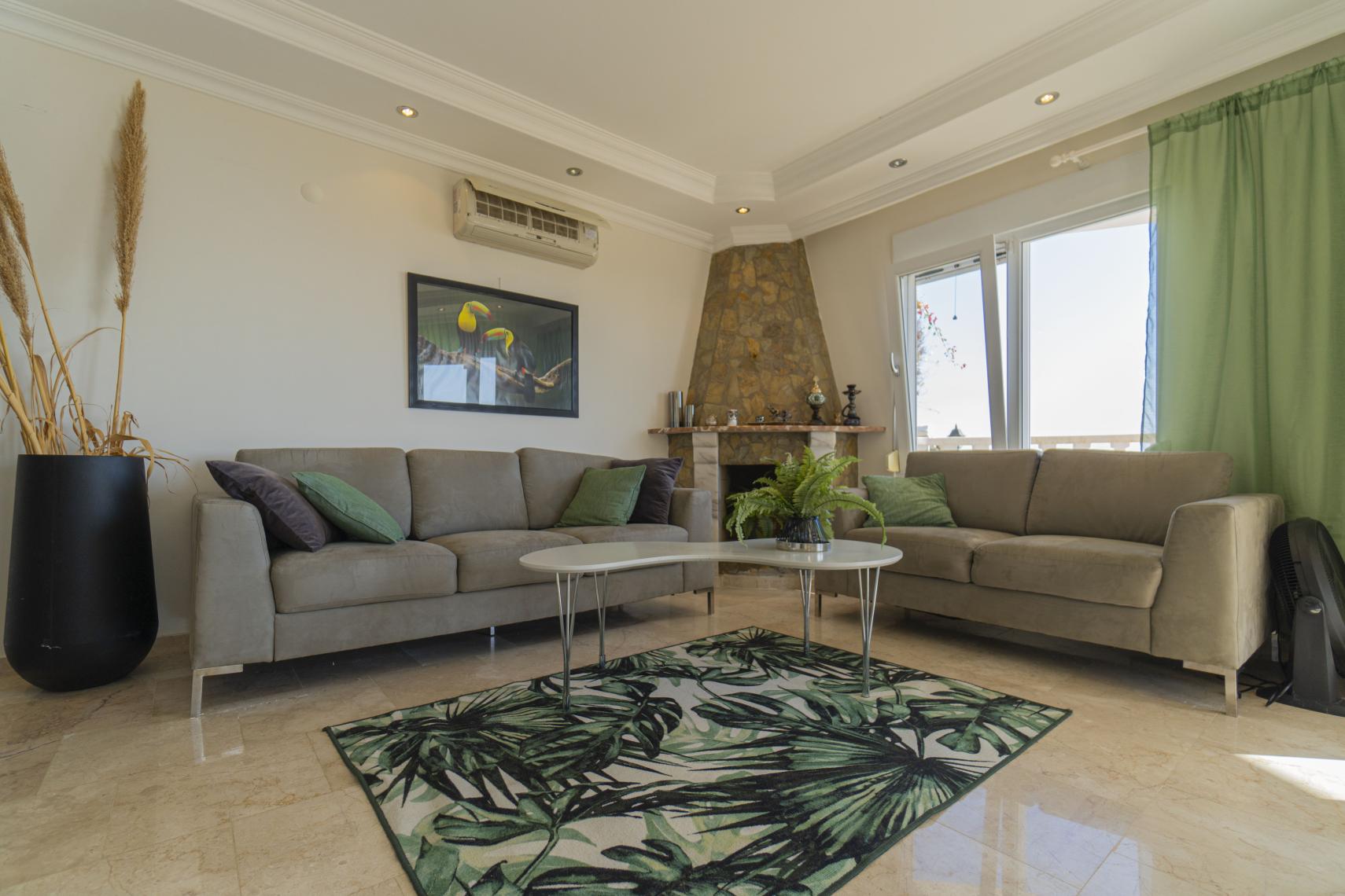 Кондиціонер для обігріву або охолодження як вітальні, так і спалень. Привабливий камін. Одне двоспальне ліжко і два односпальні ліжка. Мебльований балкон зі столом і стільцями.
